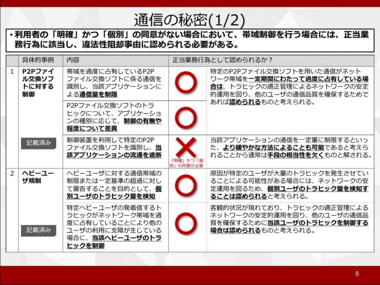 またガイドラインでは特定のヘビーユーザーやP2Pファイル交換ソフトにより帯域を占有している場合、他のユーザーの通信品質を確保する為に帯域制御が認められている。